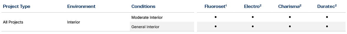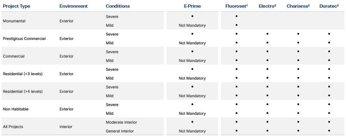 b. Severe and tropical – Duratec, Electro and Fluoroset (E-Prime base coat mandatory)