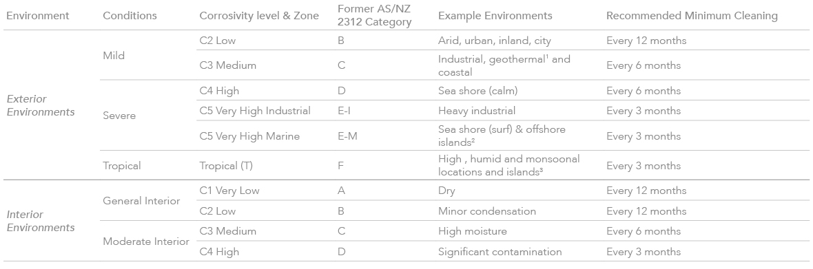 Use the following table to identify the recommended minimum cleaning and maintenance schedule for your project. The table references AS4312 and ISO12944 Atmospheric corrosivity zones in Australia to define the environmental conditions.