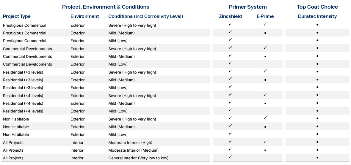 Duratec Intensity™ can also be used on the following metals, but these do not have a product guarantee. Steel (mild), bright/semi bright steel, black steel and blue steel. Galvanised steel, stainless steel and Zincalume®. Use the following table to help identify where Duratec Intensity™ can be applied on steel projects, the system required. Refer to the conditions information to determine the environment that your project will be exposed to.