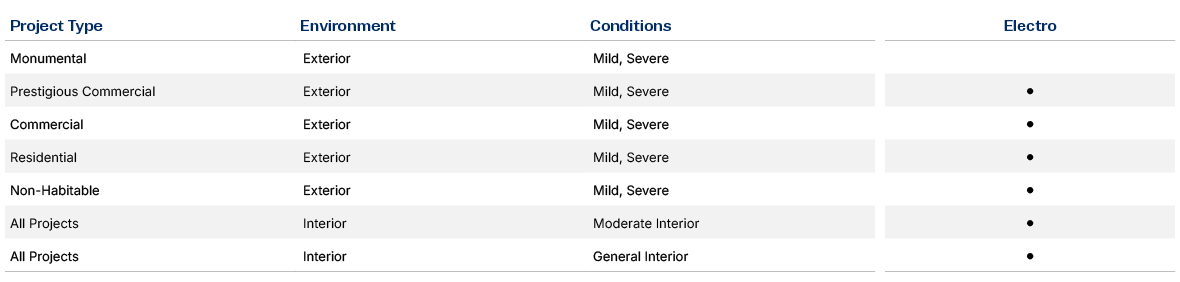 Electro™ is only suitable for coastal environments >10m from the high tide and is NOT suitable in strongly acidic or caustic environments so pH must be >5 and <9.