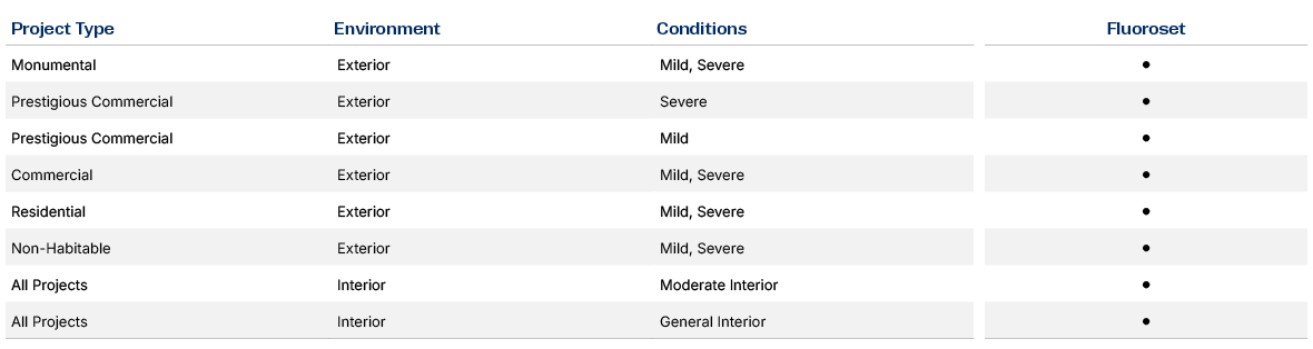 Use the following table to help identify where Fluoroset™ can be applied on aluminium projects, the system required and the DGL Alumi Shield™ warranty level available. Refer to the conditions information to determine the environment that your project will be exposed to.