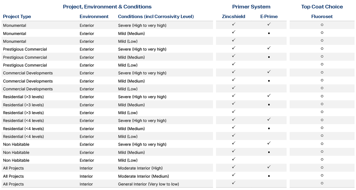 Fluoroset Allure™ can also be used on the following metals, but these do not have a product guarantee. Steel (mild), bright/semi bright steel, black steel and blue steel. Galvanised steel, stainless steel and Zincalume®. Use the following table to help identify where Fluoroset™ can be applied on steel projects and the system required. Refer to the conditions information to determine the environment that your project will be exposed to.