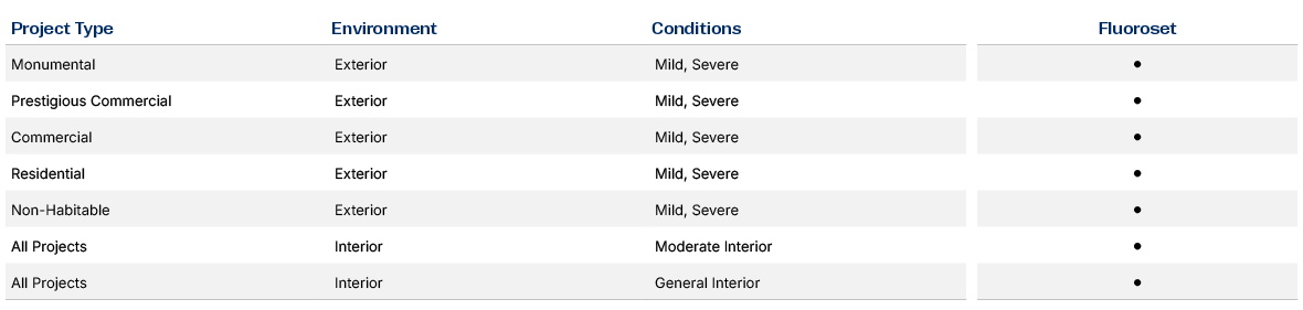 Use the following table to help identify where Fluoroset™ can be applied on aluminium projects, the system required and the DGL Alumi Shield™ warranty level available. Refer to the conditions information to determine the environment that your project will be exposed to.