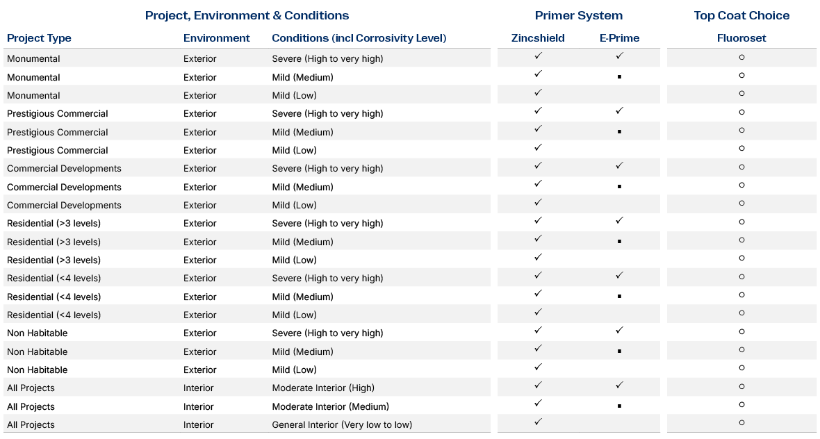 Fluoroset XTREME™ can also be used on the following metals, but these do not have a product guarantee. Steel (mild), bright/semi bright steel, black steel and blue steel. Galvanised steel, stainless steel and Zincalume®. Use the following table to help identify where Fluoroset™ can be applied on steel projects and the system required. Refer to the conditions information to determine the environment that your project will be exposed to.